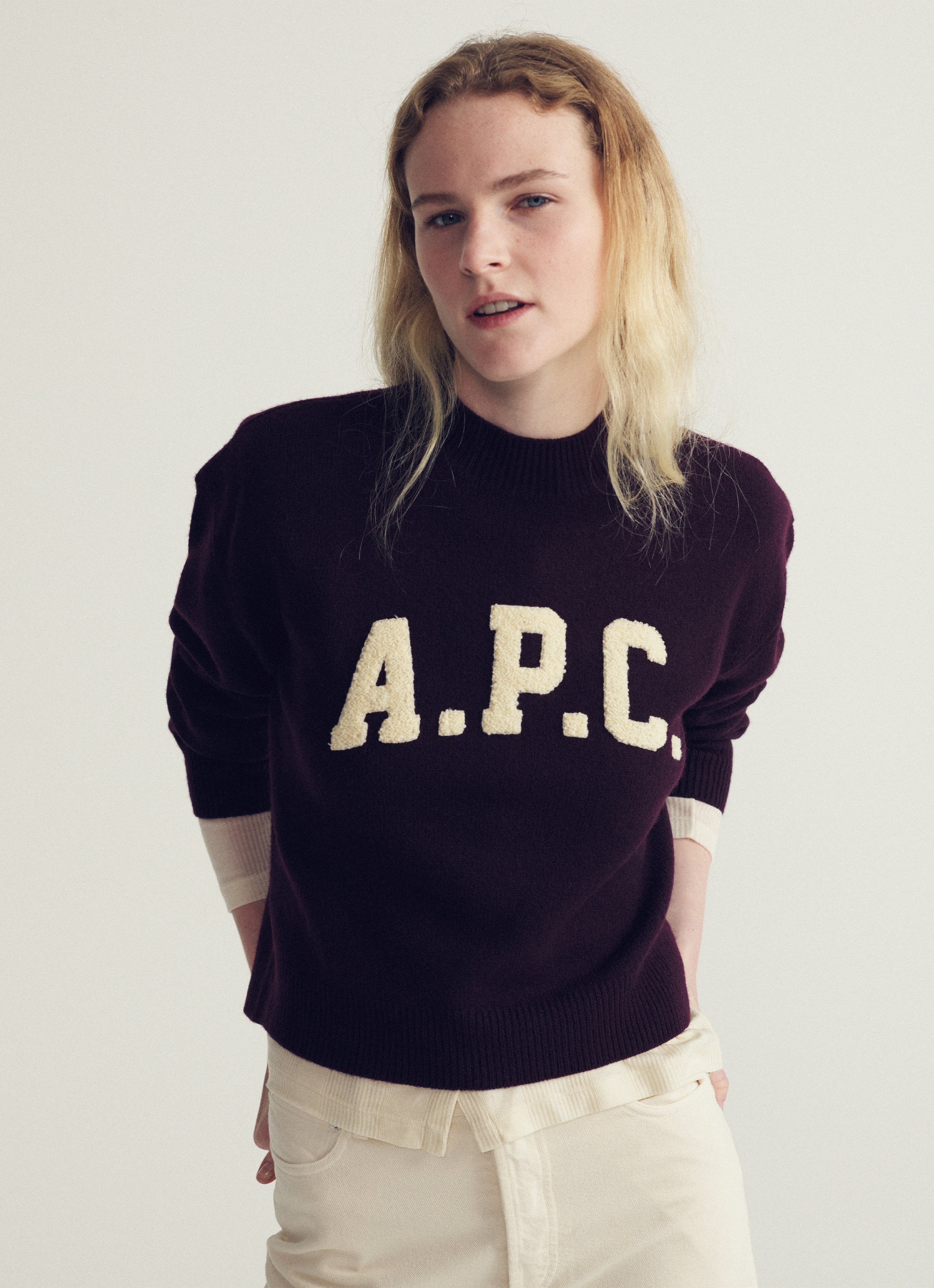 Burgundy jumper with varsity-style A.P.C. logo.