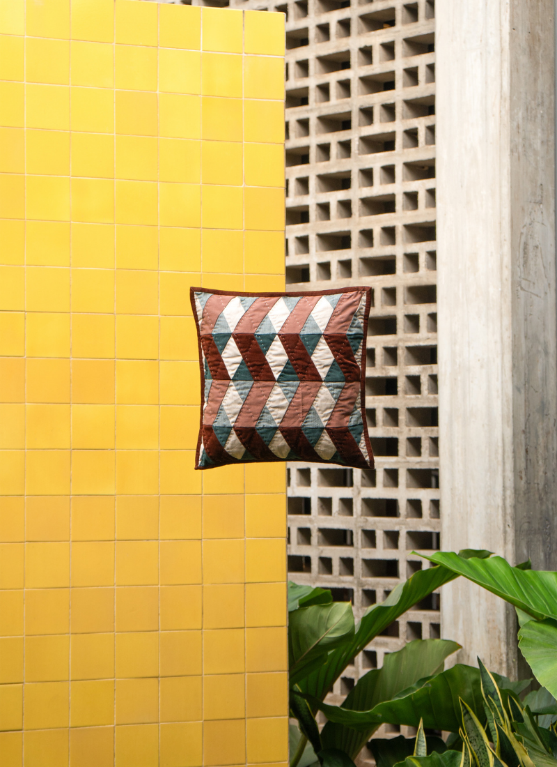 Handmade cushion created from materials used in past A.P.C. collections.